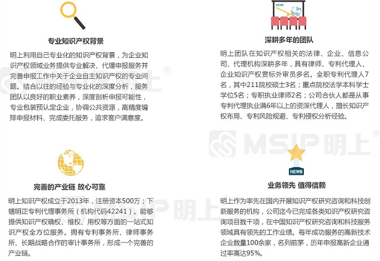 1、專業(yè)知識產(chǎn)權背景——明上利用自己專業(yè)化的知識產(chǎn)權背景,為企業(yè)知識產(chǎn)權領域業(yè)務提供專業(yè)解決、代理申報服務并完善雙軟認證中關于企業(yè)自主知識產(chǎn)權的專業(yè)問題。